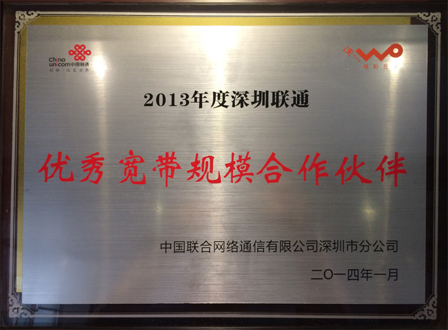 2013年度深圳聯通 優秀寬帶規模合作伙伴