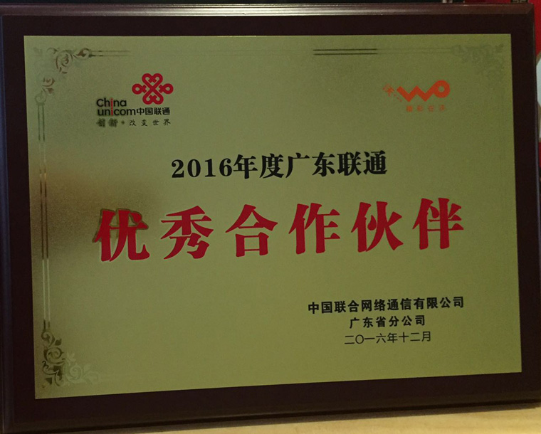 榮獲2016年度廣東聯通“優秀合作伙伴”獎
