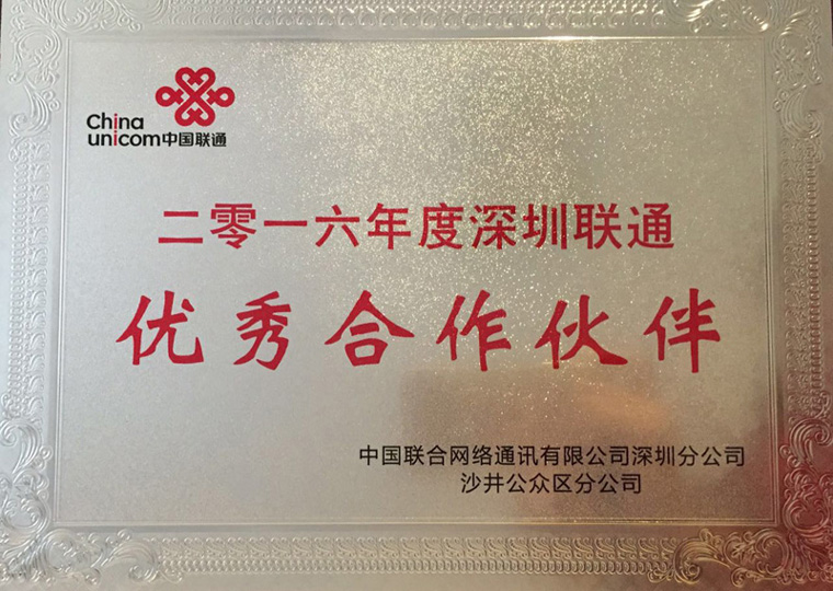 榮獲2016年度深圳聯通“優秀合作伙伴”